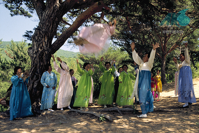 집단 놀이에 이어 각 촌의 선수들이 참가한 민속 체육 경기가 벌어졌다. 먼저 온갖 풀꽃이 향기를 전하는 버들방천의 그네터부터 보기로 하자. 몇 m 높이의 흐드러진 버들가지에 그네줄이 매여져 있었는데, 각 촌의 그네 선수들은 치맛자락을 날리면서 오색 찬연한 무지개를 수놓고 있었다.