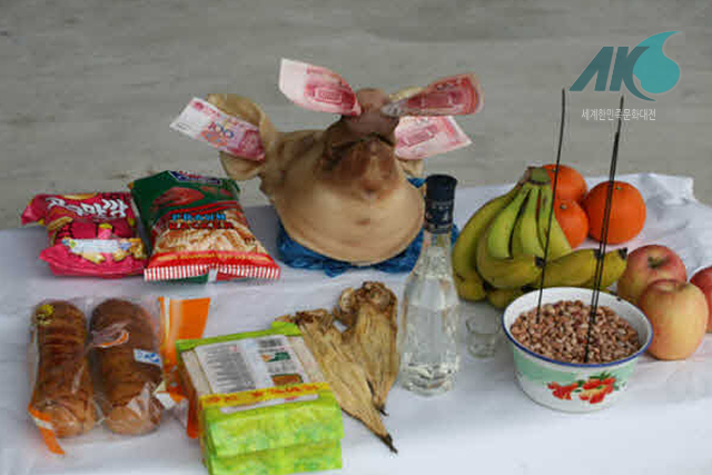 중국 연변 지역의 한인들이 제사를 지낼 때 제물을 갖추어 놓는 상차림.