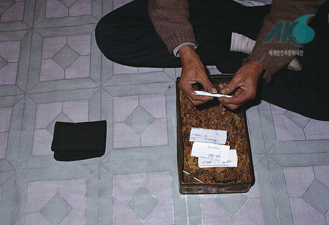 동북3성 지역 한인들이 종이, 헝겊, 가죽 따위로 만들어 살 담배나 잎 담배를 넣고 다니는 주머니.