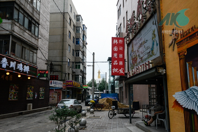 압록강변에서 시내 쪽으로 들어서면 육위로(六緯路)가 나온다. 입구에는 높은 기둥을 세워 팔작지붕을 얹고 단청도 칠하고 ‘조한 풍정가(朝韓風情街)-조선 한국 민속거리’라는 현판을 걸었다. 2차선의 도로 폭을 가진 길 하나를 사이에 두고 양옆으로 한글 간판이 즐비하다. 북한과 한국의 특색이 있는 거리라는 의미를 가지고 있는 ‘조한 풍정가’는 육위로에서 칠위로(七緯路)까지 이어진다. 북한에 있을 수 없는 한국의 거리와 한국에 있을 리 없는 북한의 거리가 단동 육위로에 함께 있다. 두 나라가 하나의 거리에 있다고 현판이 먼저 말해주고 있다.