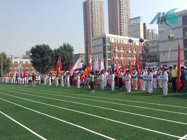 필자가 택시를 타고 심양시 조선족6중학교에 이르자 벌써 많은 인파로 주차할 공간조차 없었다. 운동장으로 들어서자 부채춤을 연습하는 부녀자들, 타이즈를 신고 율동 연습하는 학생들 등 다양한 동호회와 학생들로 정신이 없었다. 어제 저녁에 전화로 약속한 심양조선족예술관 부관장님을 찾으려 이른바 주석단 즉 중앙연단을 향하여 갔다. 부관장님은 없었고 관계자를 붙들고 물어보니 너무 바빠서 찾을 수 없다고 한다. 매우 난감해 하고 있을 때 힘찬 행진 소리와 함께 공식 일정이 시작되었다. 오전 9시부터 각 지역을 대표하는 35개 팀이 늠름하고 씩씩하게 입장하였다.