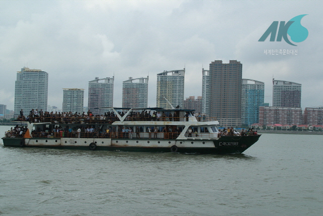 요령성 단동시 연강 개발구(沿江開發區)압록강 단교 선착장에서 승선하는 유람선.