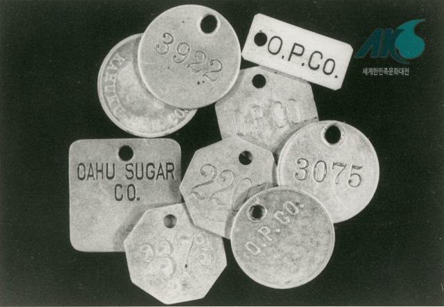 개항기 미국 하와이 초기 한인 사탕수수 농장 이주 노동자들이 목에 걸고 다녔던 알루미늄 번호표.