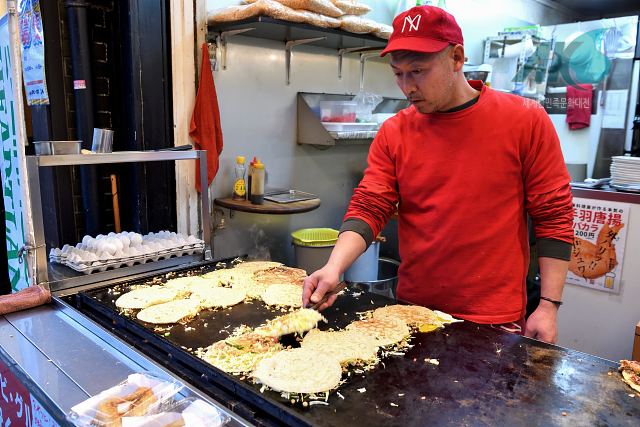 한편 전후 암시장에서 새롭게 각광받게 된 일본 음식으로 오코노미야키[お好み焼き]를 꼽을 수 있다. 오코노미야키는 ‘좋아하는 것[お好み]을 구워 먹는다[焼き].’는 의미로 밀가루 반죽에 양배추와 각종 채소, 어패류, 육류등을 올려 철판 위에서 파전처럼 구운 다음 소스, 마요네즈, 파래가루 등을 뿌려먹는 음식이다. 오코노미야키는 일본의 전통적인 음식이 아니라 근대화가 급속하게 진행되던 1920년대에 등장한 음식인 돈돈야키에서 그 유래를 찾을 수 있다. 돈돈야키는 밀가루 반죽에 고기를 얹어 구워 먹는 형태였는데 크기가 작았고, 술안주나 밥반찬으로 먹기도 했다. 1930년대에는 오늘날 대중적 요리인 오코노미야키가 화류계 음식으로 인식되기도 했다. 당시 도쿄 긴자의 문화를 다룬 기사에 오코노미야키가 등장하는데 이 시기 오코노미야키 식당은 순수한 음식점이라기보다 화류계 여성들이 남성을 접대하는 풍속업소로 묘사되었다. 가격 및 접근성에서 현재와 같은 대중적인 음식이 된 것은 1930년대 말에서 1940년대 초반 사이였다. 아사쿠사의 소메타로가 한 장의 가격을 5전으로 책정함으로써 다소 고급 음식 이미지가 있었던 오코노미야키를 대중친화적인 음식으로 만들었다고 알려진다. 하지만 전쟁이 본격화되면서 식량을 비롯한 각종 물자는 통제를 받았기 때문에 대중 음식으로서의 오코노미야키는 전후가 되어서야 본격적으로 새로운 역사를 쓰기 시작했다. 식량 사정이 열악했던 전후에는 기본 재료 중 양배추 양이 늘어나고 각종 재료를 혼합한 형태로 오코노미야키가 발전했다. 오코노미야키의 원형은 도쿄에서 비롯한 것으로 보이지만 전후에는 오사카 암시장의 포장마차에서 크게 인기를 얻어 오코노미야키는 오사카의 대표적인 음식으로 인식되고 있다. 현재 전국적으로 판매되는 오코노미야키는 오사카 방식이 주류를 이루고 있다. 한편 히로시마도 오코노미야키를 대표적인 지역 음식으로 내세우고 있다. 원자 폭탄 투하로 폐허가 된 히로시마에 오사카와는 다른 방식의 오코노미야키를 파는 포장마차촌이 암시장의 명물이 된 것이다. 히로시마에서는 반죽에 국수를 추가해 오사카와는 다른 방식의 오코노미야키를 발전시켰다. 반죽과 혼합물만으로 조리되었던 오코노미야키에 소스와 마요네즈로 맛을 더하는 방식도 전후에 개발된 것이다. 오코노미야키 위에 소스를 뿌리는 것은 1948년 농후 브라운 우스터 소스 발매, 1952년 오코노미야키 전용 소스 발매 이후 보편화된 것이다. 1953년에는 오사카의 보테쥬우 식당이 카운터 형식의 테이블을 선보였고, 오코노미야키에 우스터 소스 외에 마요네즈를 추가하였다. 1965년 보테쥬우의 도쿄지점 개설, 1970년 오사카 만국박람회를 통해 오코노미야키는 전국적으로 확산되었다.