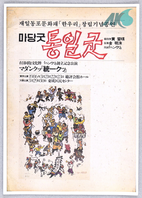 문화패 한우리는 창립 기념으로 재일 한인 사회에서 최초로 마당굿 통일굿[マグンクッ 統一クッ]을 공연하였다. 마당굿 통일굿은 1986년 3월 21일부터 23일까지 도쿄 총평회관 홀에서 세 차례, 오사카에서 1986년 3월 29일과 1986년 3월 30일 히가시나리구민센터에서 두 차례 등 모두 다섯 차례 공연되었다. 마당굿 통일굿 실행 위원장 이회성은 인사말에서 “이번 마당굿은 반봉건 반외세의 깃발을 높이 들고 일어선 19세기의 갑오농민혁명의 정신을 이어받아 해방 후 40여 년이 지났음에도 지금 역시 계속되고 있는 분단 조국의 비극을 민중의 힘으로 지양할려고 하는 것”이며 “민족의 역사적 한을 풀어내려는 축제”라고 밝혔다.
