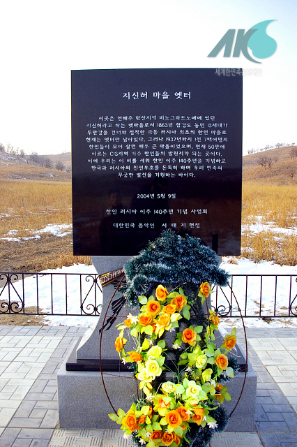 이곳은 연해주 핫산 지역 비노그라드노예에 있던 지신허라고 하는 옛마을로서 1863년 함경도 농민 13세대가 두만강을 건너와 정착한 극동 러시아 최초의 한인 마을로 현재는 옛터만 남아 있다. 그러나 1937년까지 1천 7백여 명의 한인들이 모여 살던 매우 큰 마을이었으며, 현재 50만에 이르는 CIS 지역 거주 한인들의 발원지가 되는 곳이다. 이에 우리는 이 비를 세워 한인 이주 140주년을 기념하고 한국과 러시아의 친선 우호를 돈독히 하며 우리 민족의 무궁한 발전을 기원하는 바이다. 2004년 5월 9일. 한인 러시아 이주 140주년 기념 사업회, 대한민국 음악인 서태지 헌정”