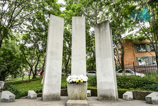 신한촌 기념비가 3개의 큰 기둥과 8개의 작은 돌로 구성되어 있다.