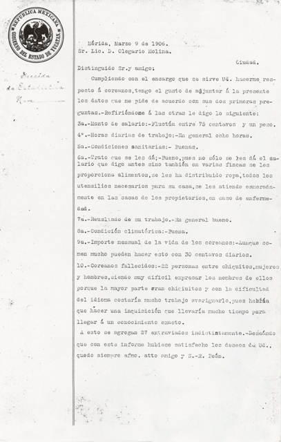 1906년과 1908년 멕시코 주재 일본 공사의 요청에 따라 유카탄주지사 올레가리오 몰리나(Olegario Molina)가 각 지역 에네켄 농장주들에게 한인 노동자들의 실태를 조사하도록 공문을 보내어 제작되었다.
