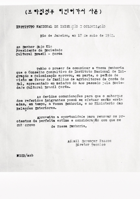 김수조는 브한문화협회라는 현지 법인을 설립하고 브라질 국립이민 및 식민연구원[Instituto Nacional de Imigração e Colonização, INIC]에 한국 집단 농업 이민 계획과 이주자 명단을 제출하였다. 1962년 5월 17일 34가구에 대한 이민자 지명 허가를 받았다. 브라질 정부는 브한문화협회의 김수조 앞으로 이민허가서를 발급하고, 사전 입국 지명허가서 사본을 한국 정부의 보건사회부 이민과에도 발송하면서 한국에서 이민 절차가 시작되었다. 이후 김수조는 브라질 INIC로부터 자신의 명의로 116가구의 한국 이민 쿼터를 배정받았고, 브라질 제1차 집단 영농이민의 길을 열었다.