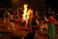 길림성 연변조선족자치주 왕청현 합마당 농악 놀이에서 왕청현 과외 예술단이 달집태우기 공연을 보이고 있다.