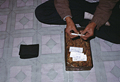 담배삼지에서 꺼낸 종이로 담배를 말고있다.
