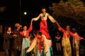 길림성 연변조선족자치주 왕청현 합마당 농악 놀이에서 왕청현 과외 예술단이 놋다리 밟기 공연을 보이고 있다.