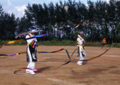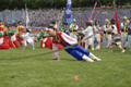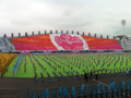 제16차 연변 체육 경기 대회 개막식 축하 공연으로 연길시 북산가도「상모춤」의 모습이다.