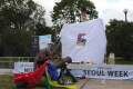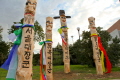 서울대장군, 뉴욕대잔군, 한국인의 미소, 퀸즈여장군 총 4기의 장승이 세워진 모습이다.